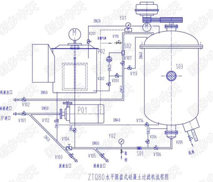 過濾時,首先在過濾盤上形成硅藻土預涂層。被過濾的液體經硅藻土預涂層時,其中的雜質即被阻擋;而純靜的液體經過微觀管狀或片狀的間隙以及顆粒之間的間隙通過過濾層,從而起到過濾作用。隨過濾時間的推移,在預涂層上被濾掉的雜質會越來越多,且將阻塞過濾通道。因此在過濾過程中,還需對進入過濾罐的被過濾的液體,添加一定劑量相應粒度的硅藻土,以維持正常的過濾過程。另外,如果過濾時需要脫色,還需加入一定比例的活性炭。