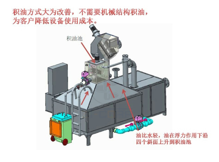 該油水分離裝置主要利用油與水的比重不同,油比水輕,油在浮力作用下沿著隔油池斜面上升到集油池,油集聚到一定的量而自動排出,分離后的水從另一端(提升站)排出,從而實現餐飲廢水以及其它油污廢水的油水分離,進而實現油品綜合利用,外排廢水動植物油的含量達到環保標準。
